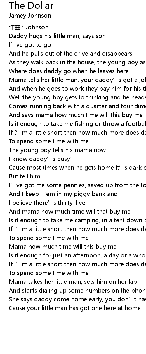 | She says daddy come home early, you don' t have to chase that dollar' | |