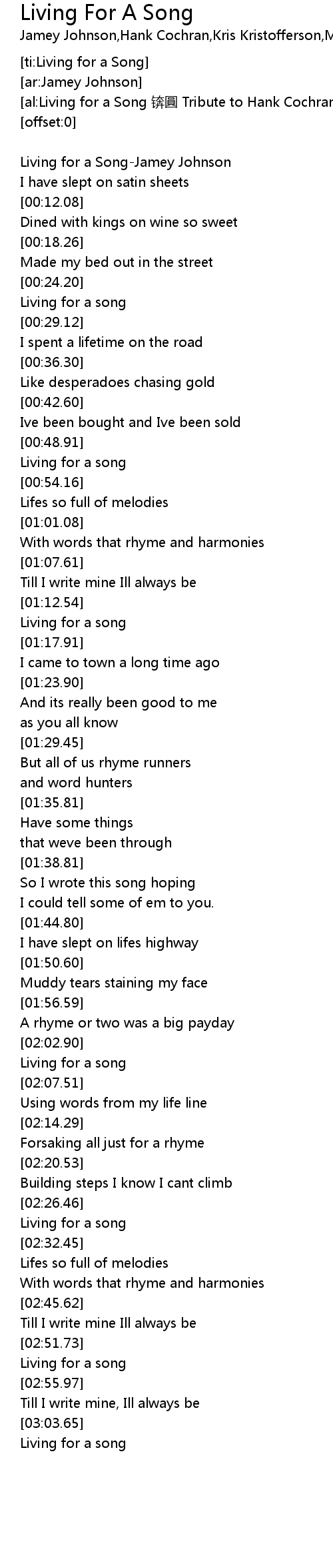 | [00:00.76] | Living for a Song-Jamey Johnson |