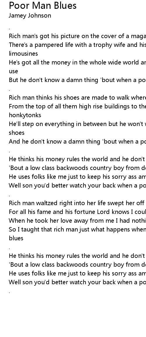 But he don't know a damn thing 'bout when a poor man gets the blues |
