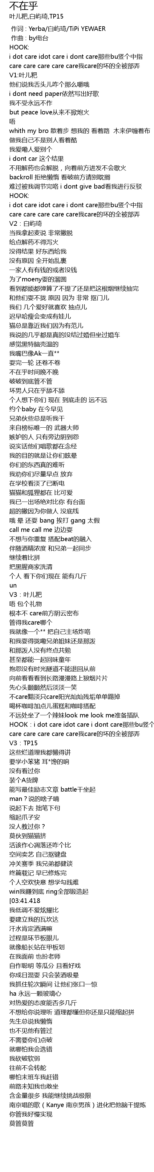 | [03:01.619] | HOOK: i dot care idot care i dont care nèi xiē bu shù gè zhōng zhǐ |