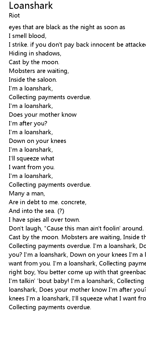 Don't laugh, "Cause this man ain't foolin' around. No way ! Hiding in shadows, Cast by the moon. Mobsters are waiting, Inside the saloon. I'm a loanshark, Collecting payments overdue. I'm a loanshark, Does your mother know I'm after you? I'm a loanshark, Down on your knees I'm a loanshark, I'll squeeze what I want from you. I'm a loanshark, Collecting payments overdue. Hey, hey, that's right boy, You better come up with that greenback dollar, Yeah, you know what I'm talkin' 'bout baby! I'm a loanshark, Collecting payments overdue. I'm a loanshark, Does your mother know I'm after you? I'm a loanshark, Down on your knees I'm a loanshark, I'll squeeze what I want from you. I'm a loanshark, Collecting payments overdue. |