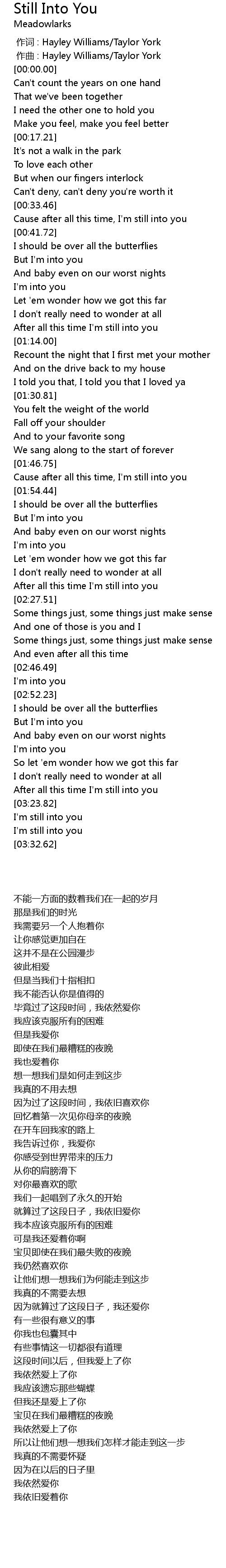 | [00:34.40] | Cause after all this time, I'm still into you |