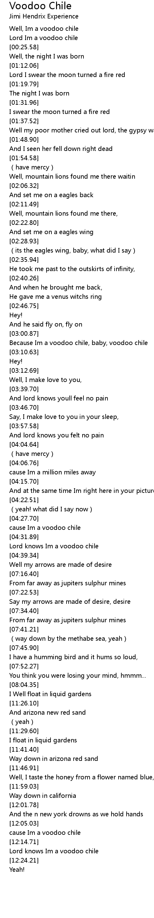 | [03:02.19] | Because Im a voodoo chile, baby, voodoo chile |