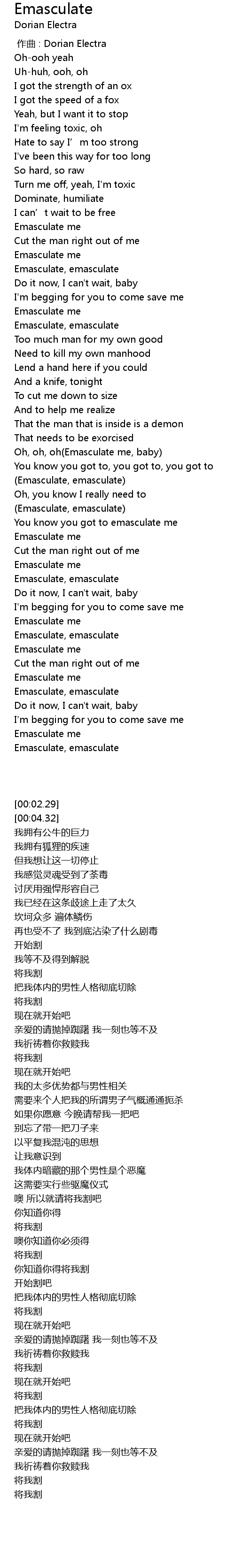 | [02:03.95] | Emasculate, emasculate |