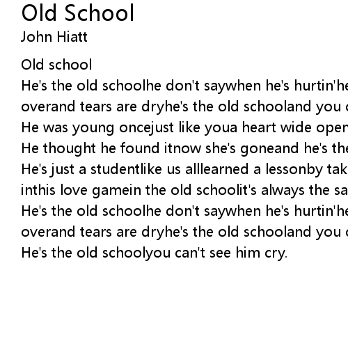 He's the old schoolhe don't saywhen he's hurtin'he'll just hide away'till it 's overand tears are dryhe's the old schooland you can't see him cry |
