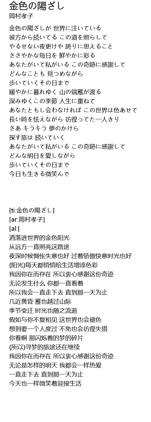 | [00:20.18] | 金色の陽ざしが 世界に注いている |