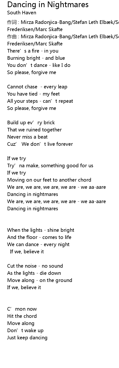 | 作词 : Mirza Radonjica-Bang/Stefan Leth Elbæk/Sebastian Stendal/Mathias Frederiksen/Marc Skafte | |