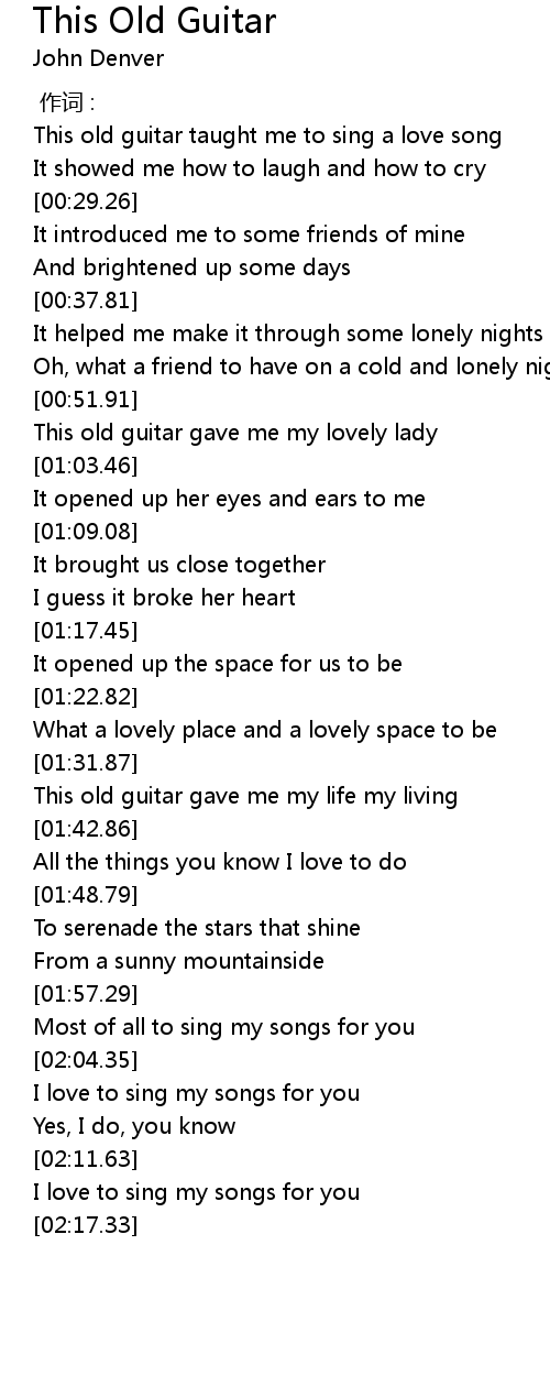 | [00:18.33] | This old guitar taught me to sing a love song |