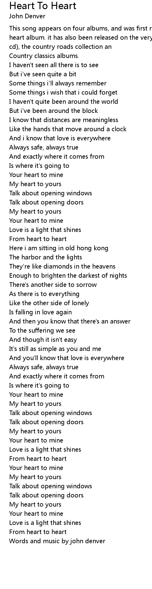 This song appears on four albums, and was first released on the seasons of the heart album. it has also been released on the very best of john denver (double cd), the country roads collection an |