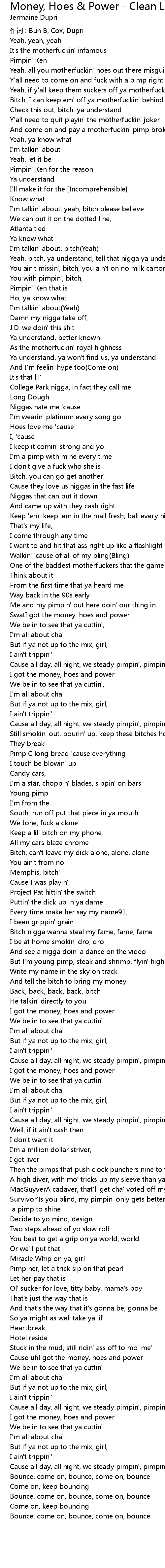 | Song | Money, Hoes & Power - Clean LP Version |