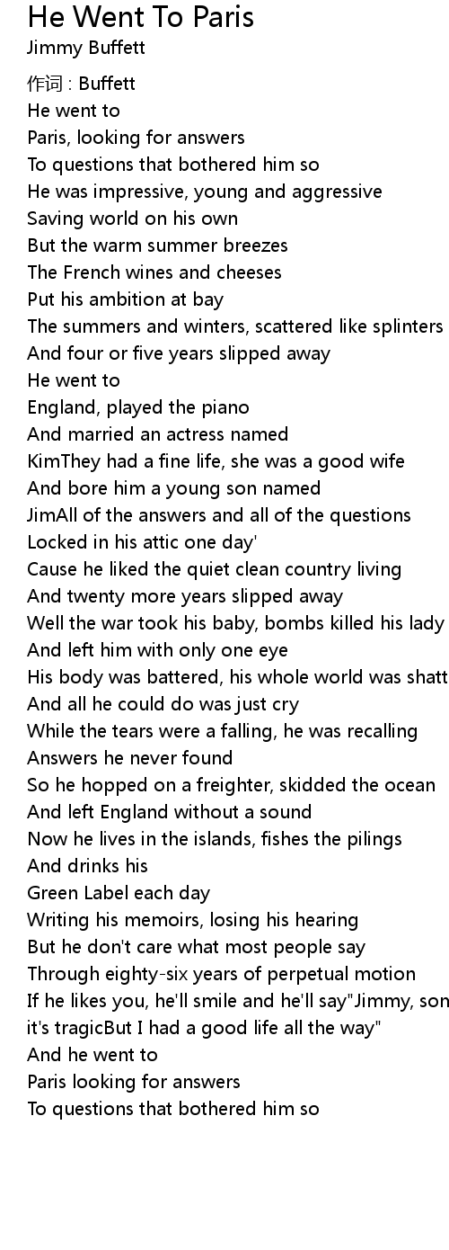 | If he likes you, he'll smile and he'll say"Jimmy, some of it's magic, some of it's tragicBut I had a good life all the way" | |