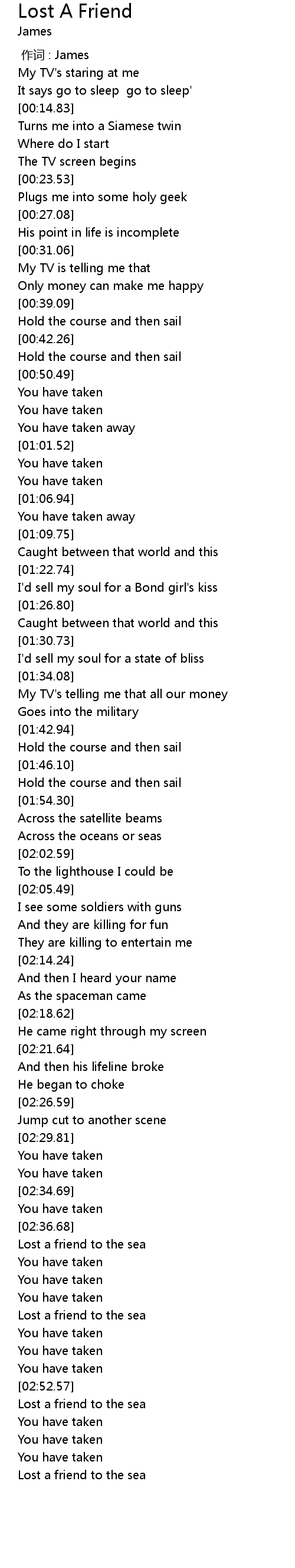 | [03:01.23] | Lost a friend to the sea |