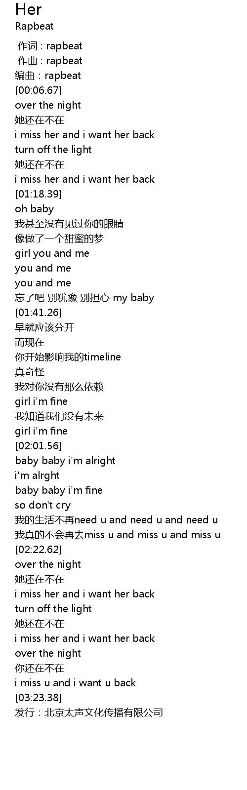 | [03:25.99] | 发行:北京太声文化传播有限公司 |