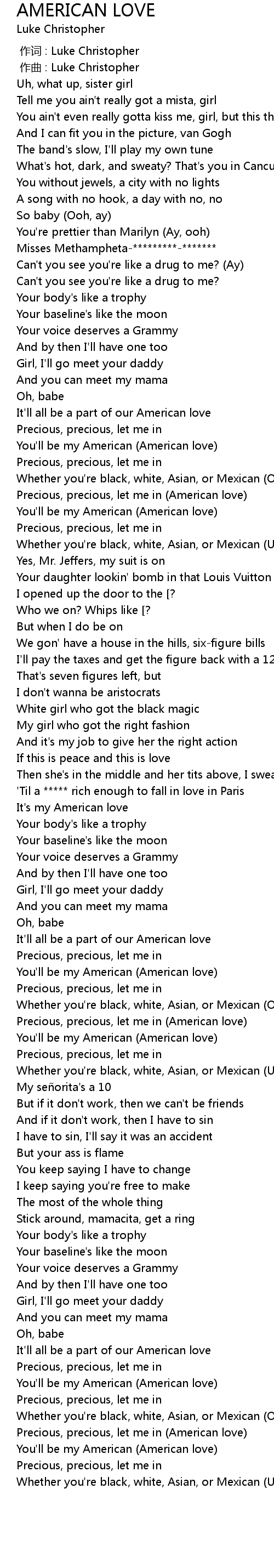 | [03:18.24] | Whether you' re black, white, Asian, or Mexican Our American love |