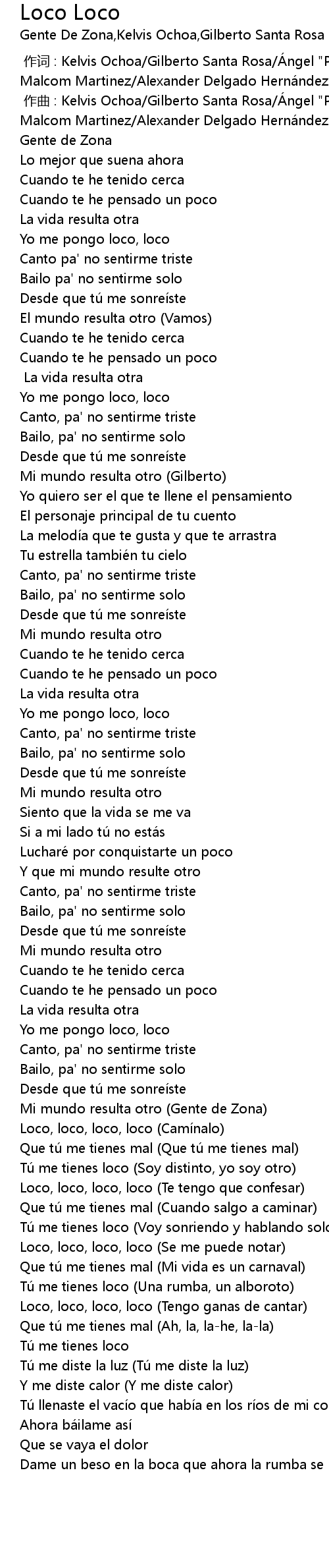 | [00:01.000] | zuo qu : Kelvis Ochoa Gilberto Santa RosaÁ ngel " Pututi" Arce Randy Malcom Martinez Alexander Delgado Herna ndez |