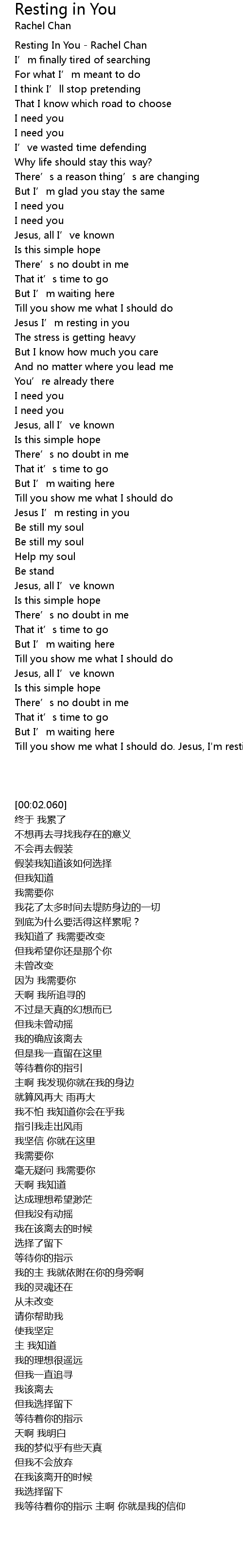 | [03:33.300] | Till you show me what I should do. Jesus, I' m resting in you. |