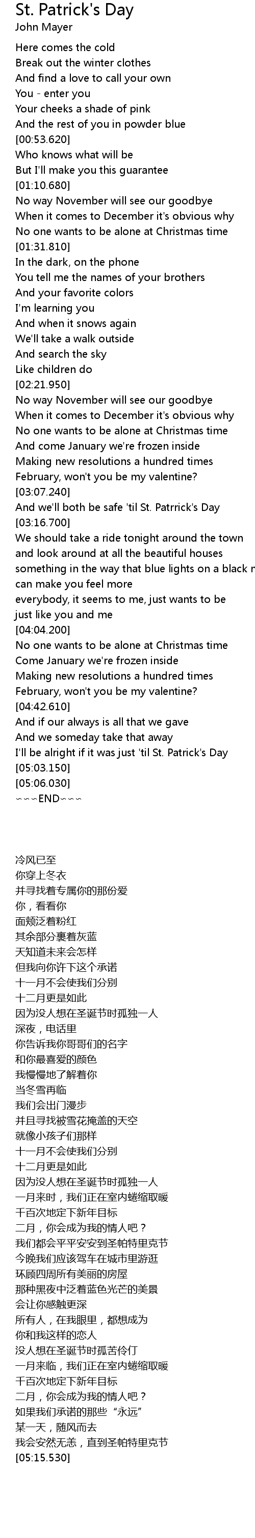 | [04:55.330] | I'll be alright if it was just 'til St. Patrick's Day |