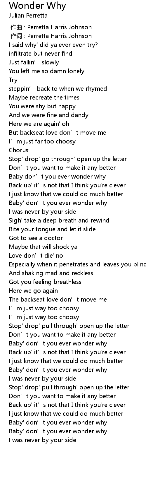 | [02:22.16] | Baby' don’t you ever wonder why |