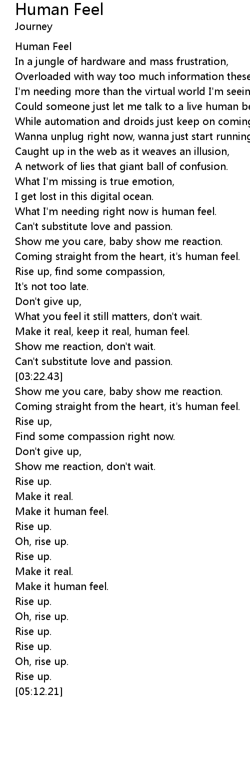 | [02:39.51] | Make it real, keep it real, human feel. |