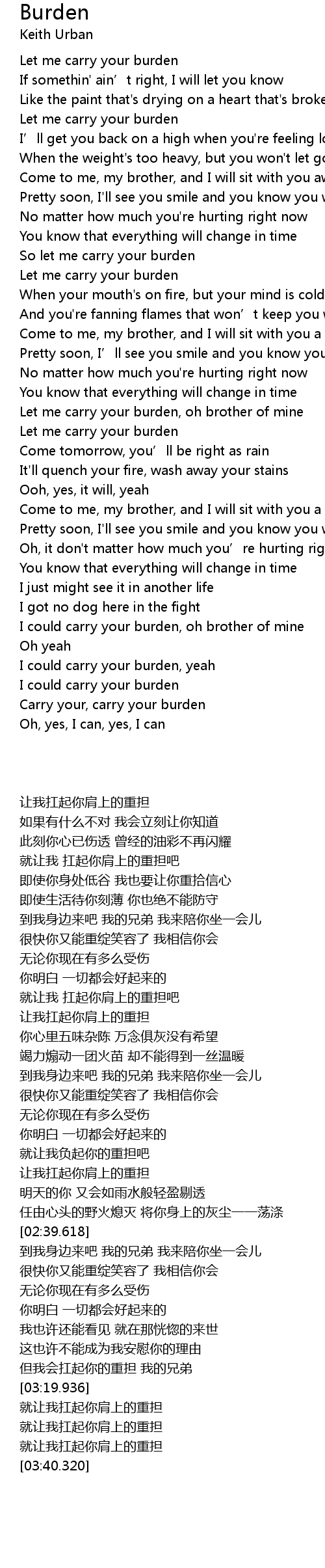 | [00:32.015] | Let me carry your burden |