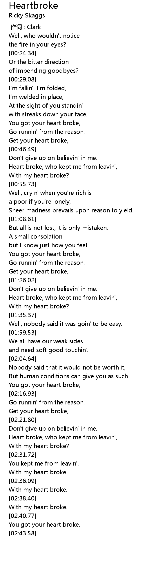 | [00:49.93] | Heart broke, who kept me from leavin', |