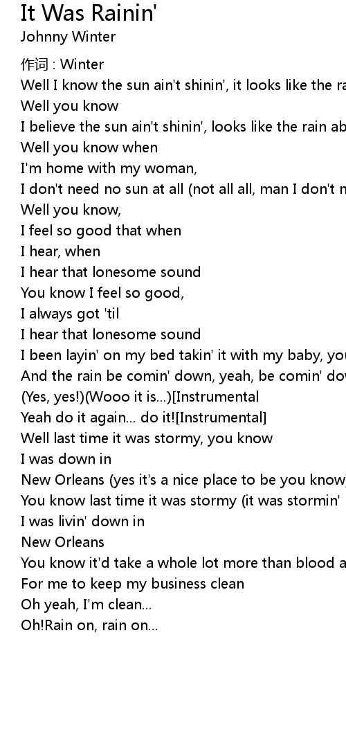 | And the rain be comin' down, yeah, be comin' down(Go ahead, play a little bit now...)[Instrumental](Yes, yes!)(Wooo it is...)[Instrumental] | |