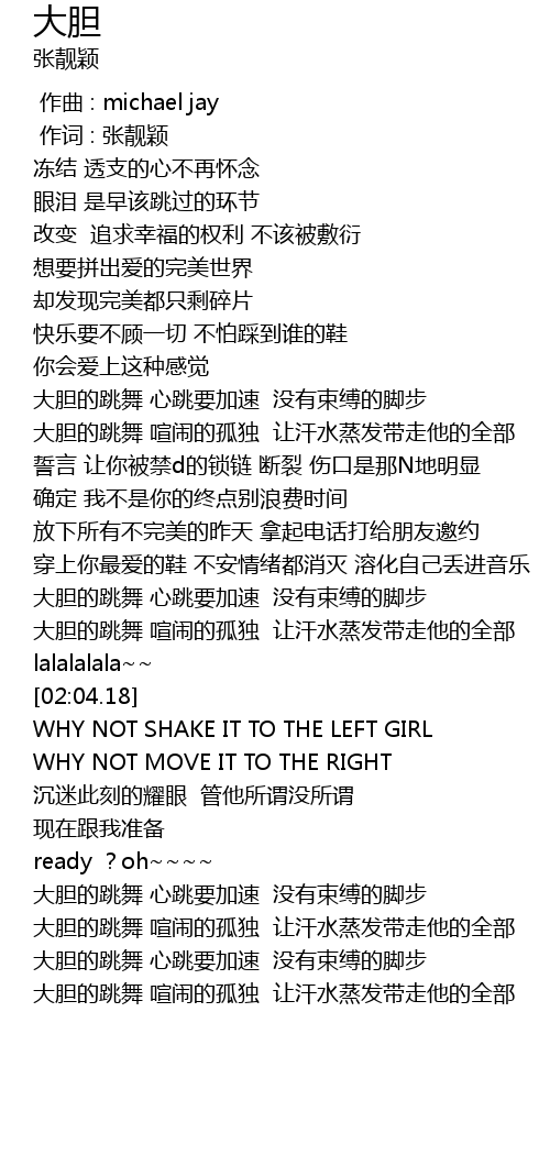 | [02:49.67] | 大胆的跳舞 心跳要加速 没有束缚的脚步 |