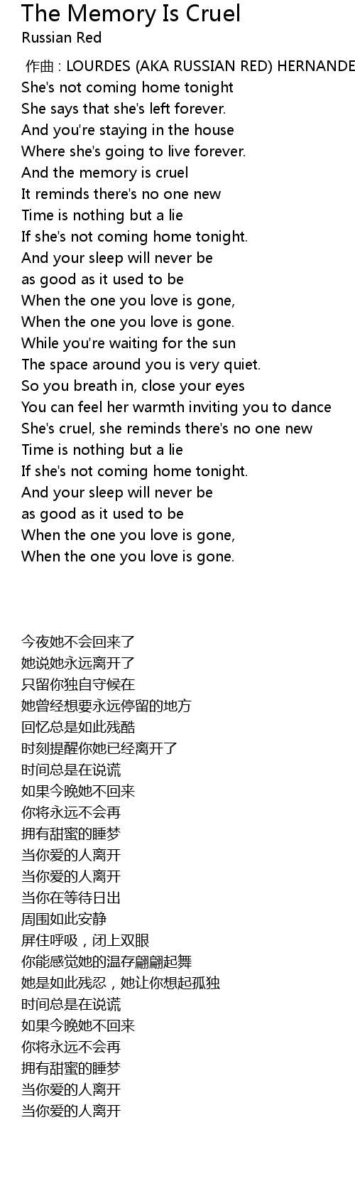 | [00:00.00] | 作曲 : LOURDES (AKA RUSSIAN RED) HERNANDEZ GONZALEZ/CARLOS MIGUEL |