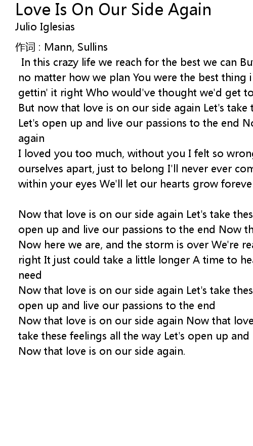 | Let's open up and live our passions to the end Now that love is on our side | |