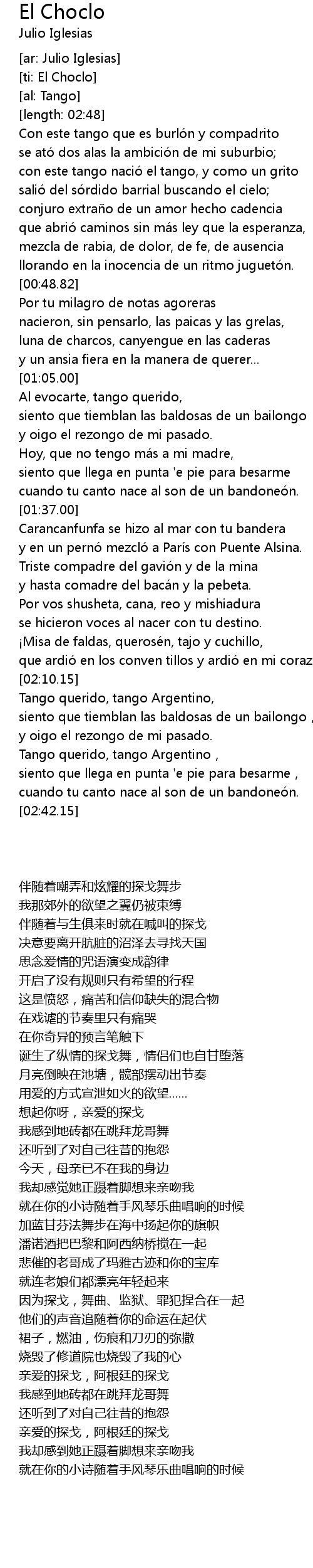 | [02:28.15] | Tango querido, tango Argentino, |