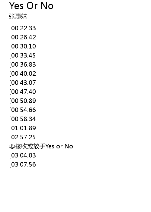 | [03:11.32][02:57.25][02:11.20][01:06.17] | 爱是个忽然的念头 要接收或放手Yes or No |