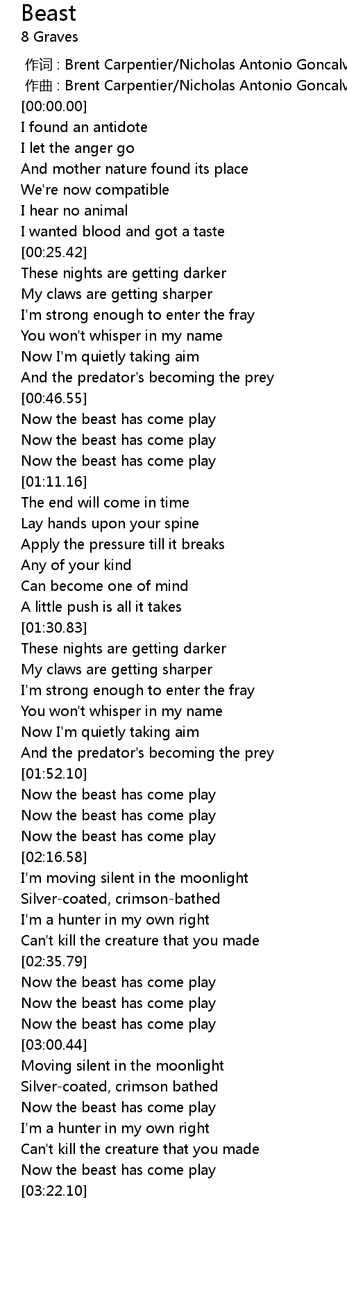 | [02:57.53] | Now the beast has come play |