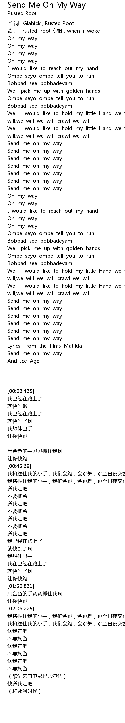 | [01:08.46] | Send me on my way |