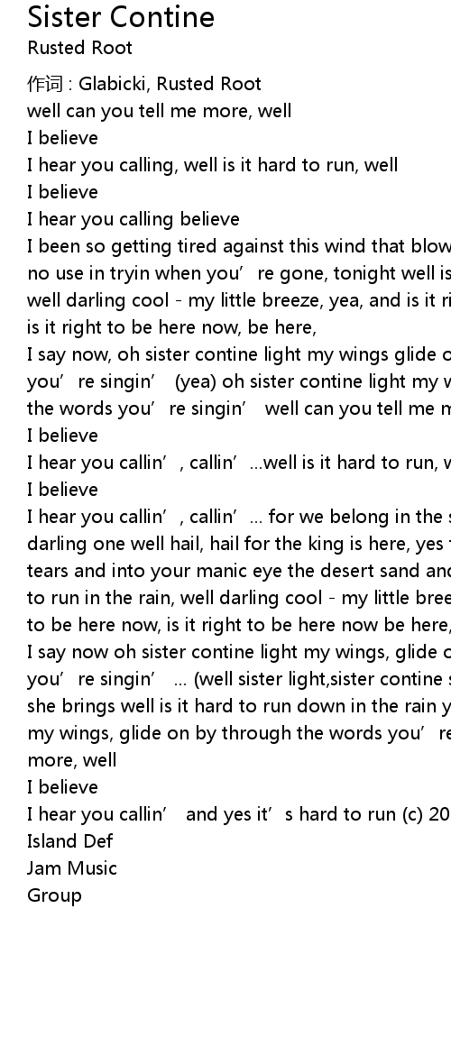 | I say now oh sister contine light my wings, glide on by through the words you’re singin’ ... (well sister light,sister contine she comes in the light she brings well is it hard to run down in the rain yea) oh sister contine light my wings, glide on by through the words you’re singin’ well can you tell me more, well | |