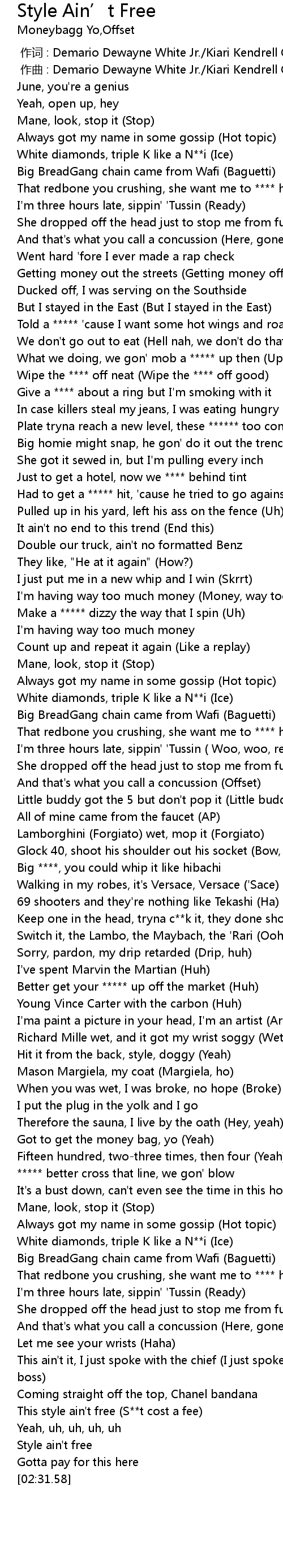 | [02:22.70] | This style ain't free (S**t cost a fee) |