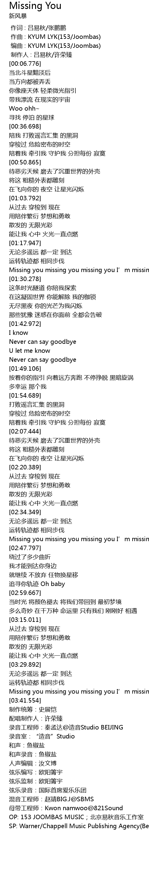 | [03:44.973] | OP: 153 JOOMBAS MUSIC;北京易秋音乐工作室 |