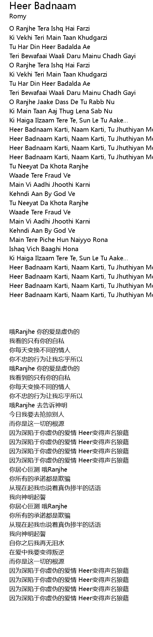 | [00:53.50] | Heer Badnaam Karti, Naam Karti, Tu Jhuthiyan Mohabbatan Paake |