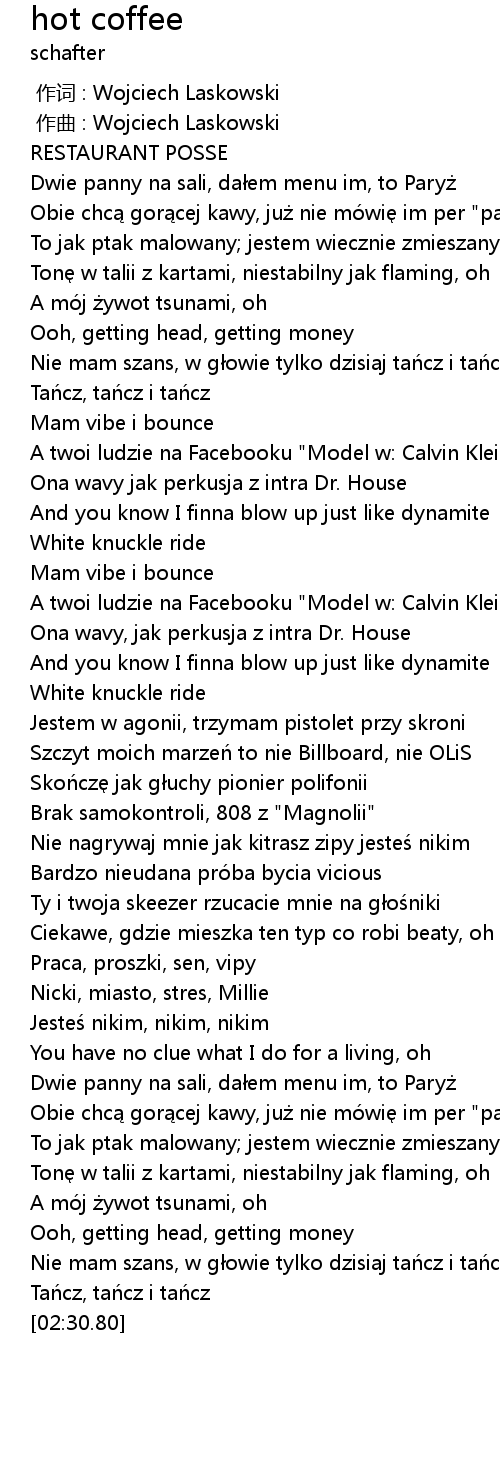 | [00:30.26] | Obie chcą gorącej kawy, już nie mówię im per "pani" |