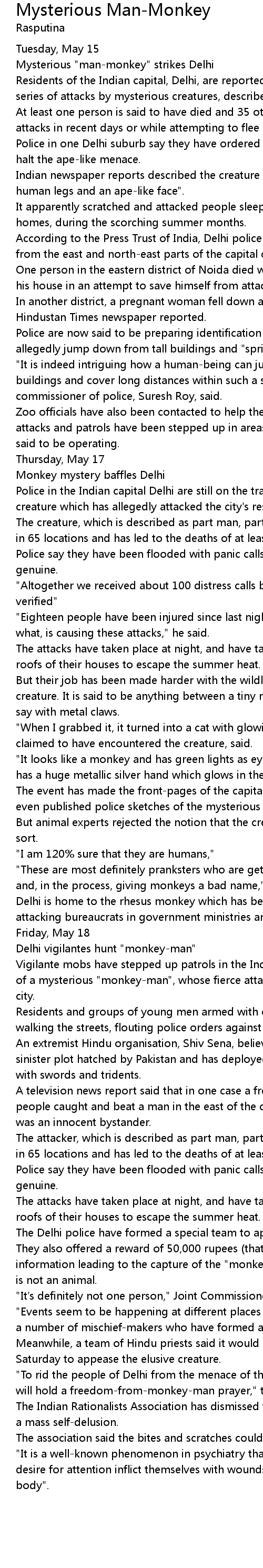 Residents of the Indian capital, Delhi, are reported to be panicking after a series of attacks by mysterious creatures, described as "man-monkeys". |