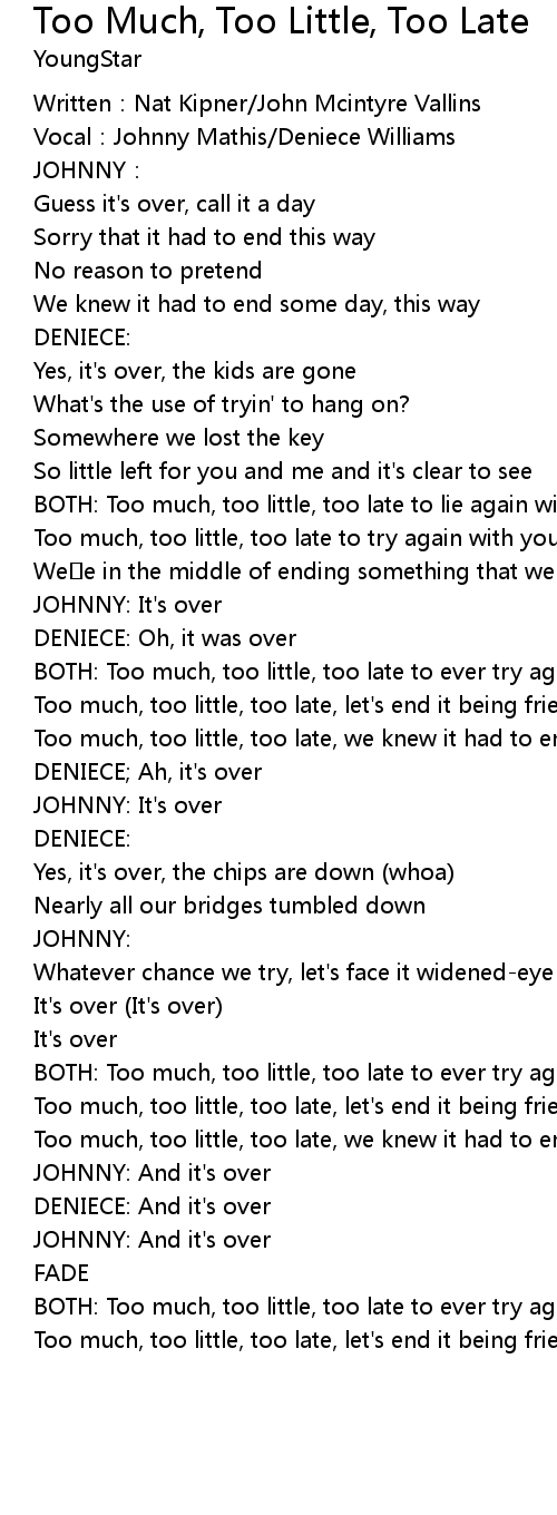 | BOTH: Too much, too little, too late to ever try again | |