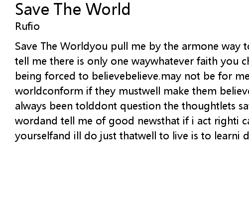 Save The Worldyou pull me by the armone way to seetell me what to believeyou tell me there is only one waywhatever faith you choocehow can i be savedwhile being forced to believebelieve.may not be for meone by onelets save the worldconform if they mustwell make them believewell make them believeits whats always been tolddont question the thoughtlets save the worldso spread the wordand tell me of good newsthat if i act righti can be like youand think for yourselfand ill do just thatwell to live is to learni dont need your help |