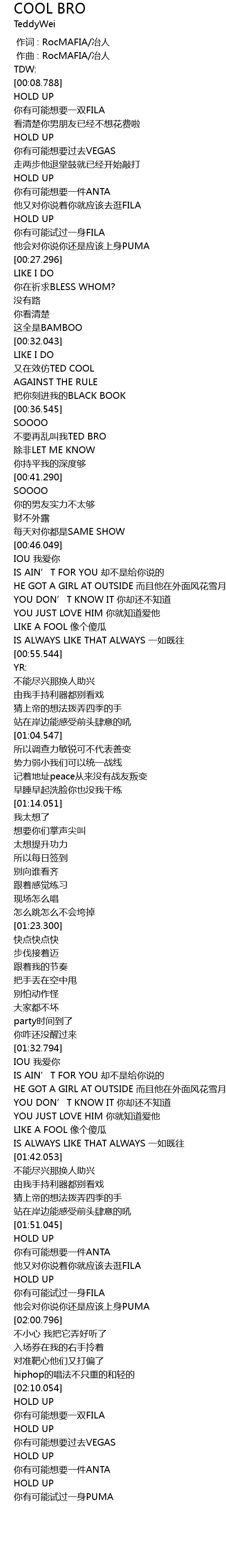 | [00:00.000] | 作词 : RocMAFIA/冶人 |