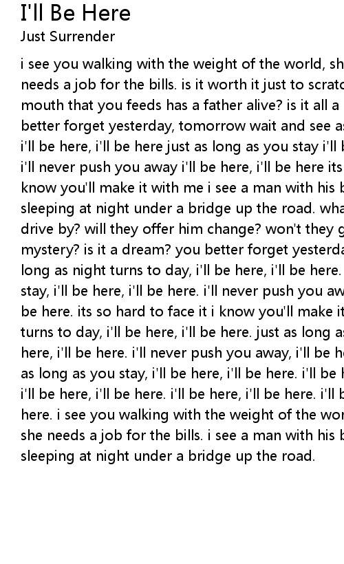 i see you walking with the weight of the world, she has a family to feed, she needs a job for the bills. is it worth it just to scratch and survive? when the mouth that you feeds has a father alive? is it all a mystery? is it a dream? you better forget yesterday, tomorrow wait and see as long as night turns to day i'll be here, i'll be here just as long as you stay i'll be here, i'll be here i'll never push you away i'll be here, i'll be here its so hard to face it i know you'll make it with me i see a man with his back to the wall, who's been sleeping at night under a bridge up the road. what can he do when the people drive by? will they offer him change? won't they give him a ride? is it all a mystery? is it a dream? you better forget yesterday, tomorrow wait and see as long as night turns to day, i'll be here, i'll be here. just as long as you stay, i'll be here, i'll be here. i'll never push you away, i'll be here, i'll be here. its so hard to face it i know you'll make it with me as long as night turns to day, i'll be here, i'll be here. just as long as you stay, i'll be here, i'll be here. i'll never push you away, i'll be here, i'll be here. just as long as you stay, i'll be here, i'll be here. i'll be here, i'll be here. i'll be here, i'll be here. i'll be here, i'll be here. i'll be here, i'll be here. i see you walking with the weight of the world, she has a family to feed, she needs a job for the bills. i see a man with his back to the wall, who's been sleeping at night under a bridge up the road. |