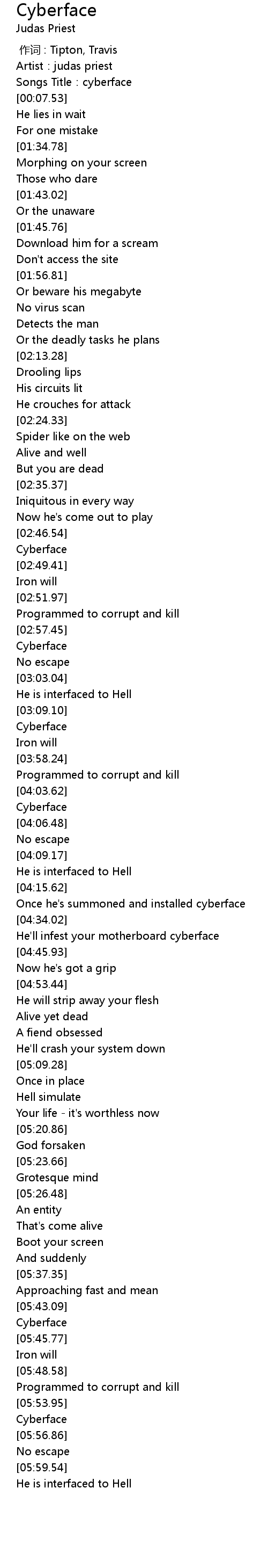| [04:37.64] | He' ll infest your motherboard cyberface |