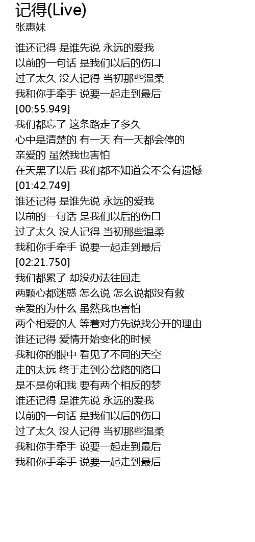| [01:43.839] | 谁还记得 是谁先说 永远的爱我 |