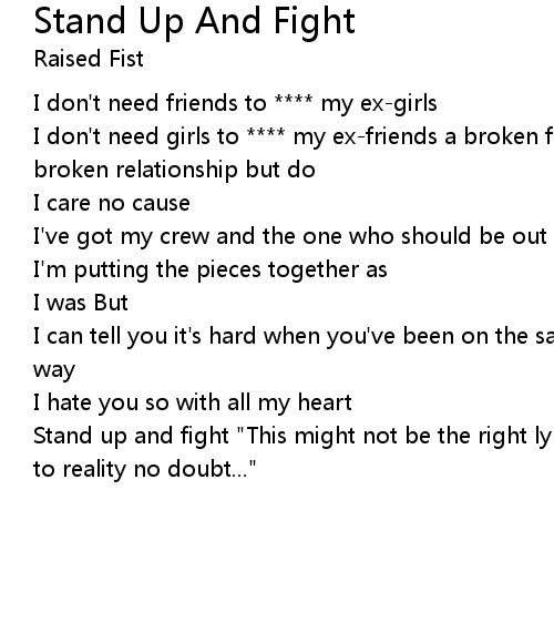 | Stand up and fight "This might not be the right lyrics but they're the closest to reality no doubt..." |