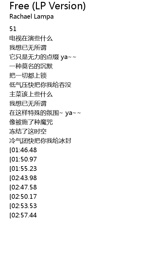 | [02:42.29][01:55.23][00:48.53] | I wanna be free |