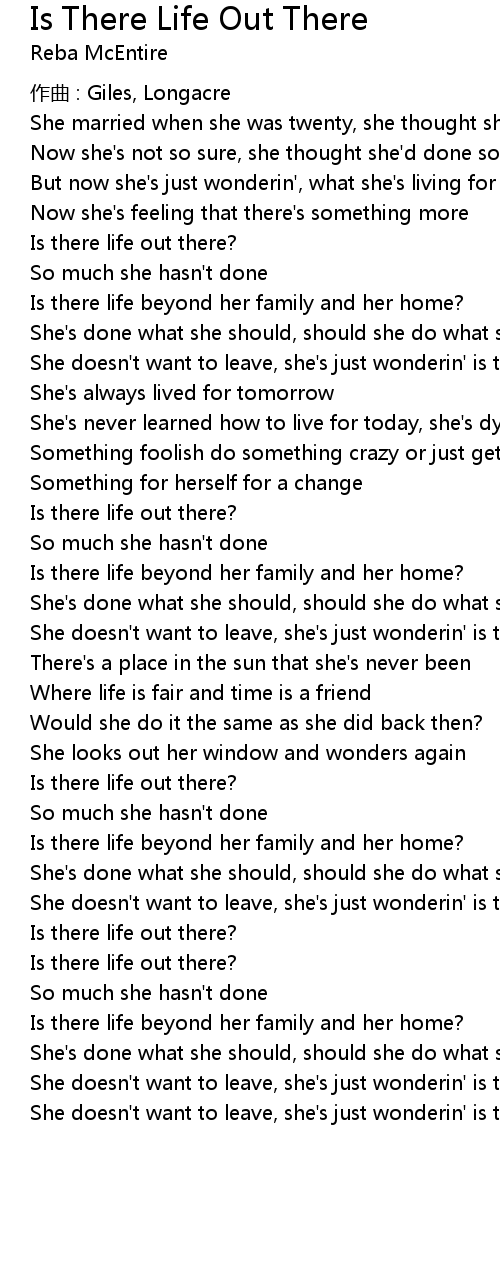 | She doesn' t want to leave, she' s just wonderin' is there life out there | |