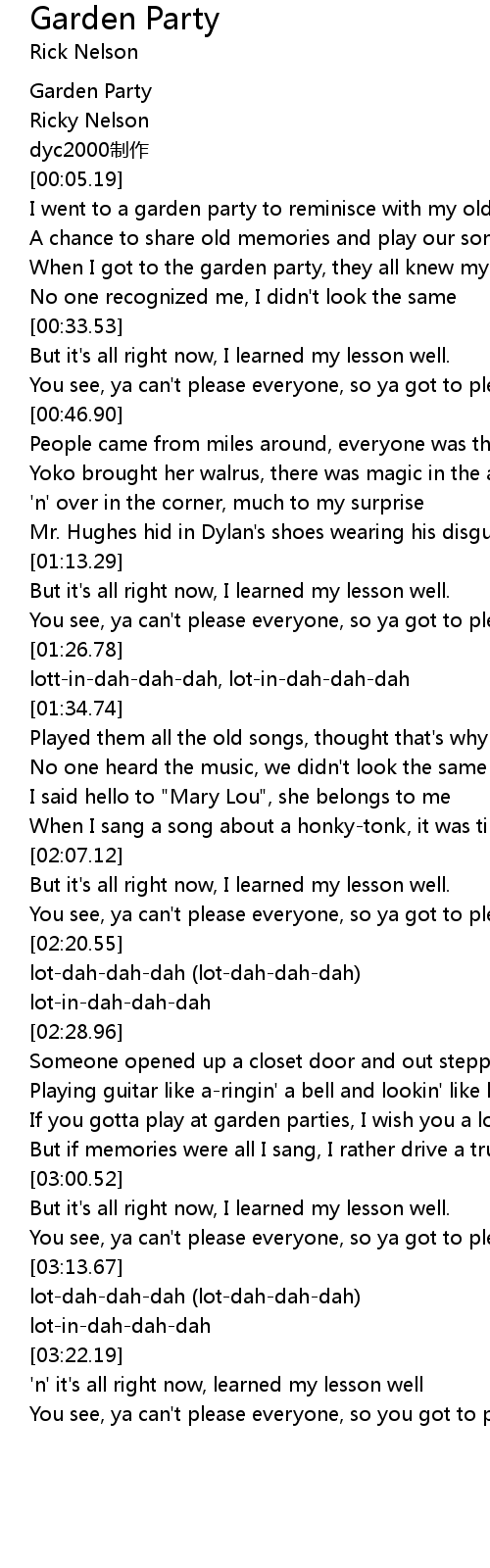 | [02:47.99] | If you gotta play at garden parties, I wish you a lotta luck |