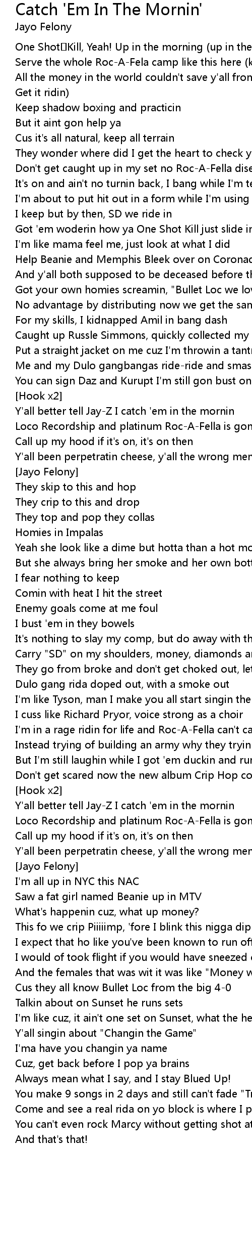| Y'all better tell Jay-Z I catch 'em in the mornin | |